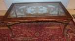 Iron base with ornate iron top trimmed in wood with glass top; 70 1/2" w., 42" d., 30" h. Iron base with ornate iron top trimmed in wood with glass top; 70 1/2" w., 42" d., 30" h.