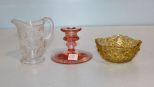 157 Daisy and Button Amber Nut Dish, Pink Depression Glass Candlestick, Press Glass Creamer