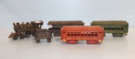 345 Vintage Iron Locomotive and Three Iron Cars, Iron Coal Bin