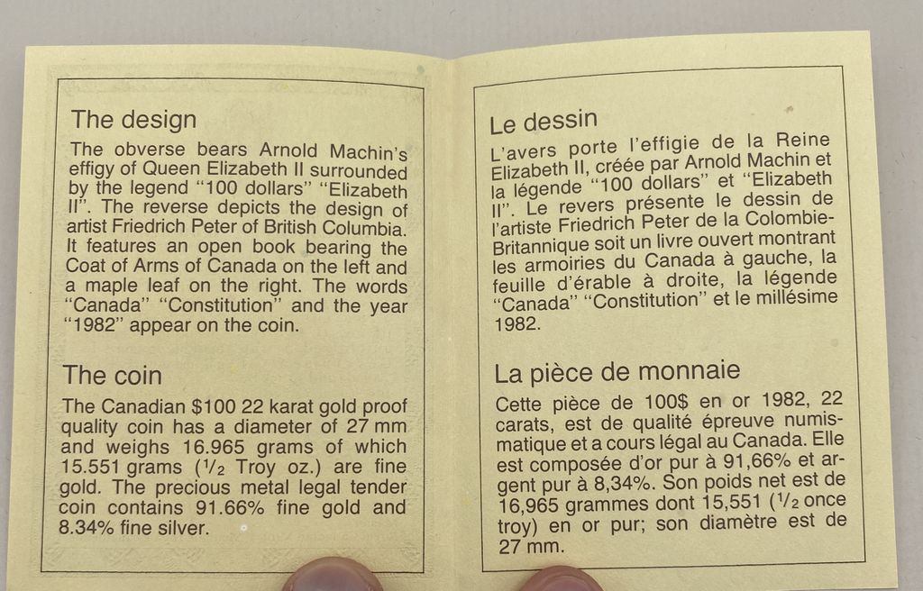 $100 Coat of Arms & Canada Constitution, 1x Canadian Gold Coin (15.551g of gold & 1.414g of silver) $100 Coat of Arms & Canada Constitution, 1x Canadian Gold Coin (15.551g of gold & 1.414g of silver)