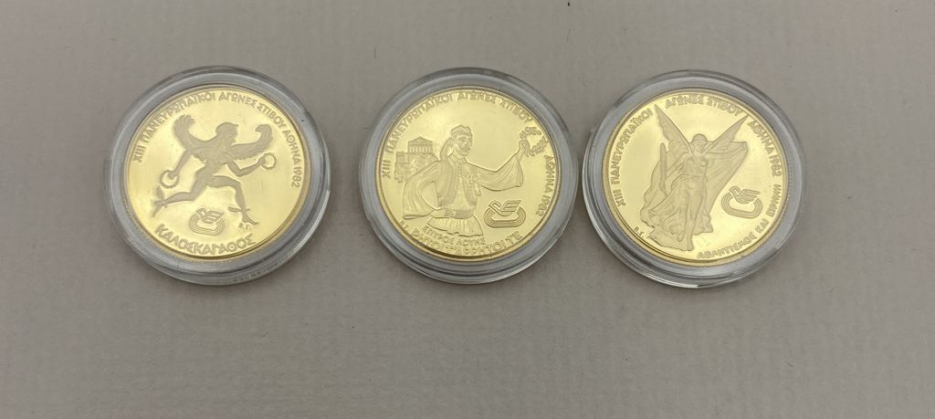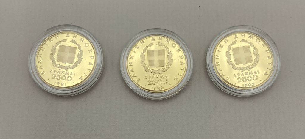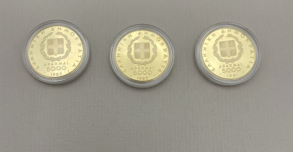1982 Greek Olympic coins set proof, 3x 5,000 Drachmai (30.48g EACH of gold), 3x 2,500 Drachmai (15.24g EACH of Gold) 1982 Greek Olympic coins set proof, 3x 5,000 Drachmai (30.48g EACH of gold), 3x 2,500 Drachmai (15.24g EACH of Gold)