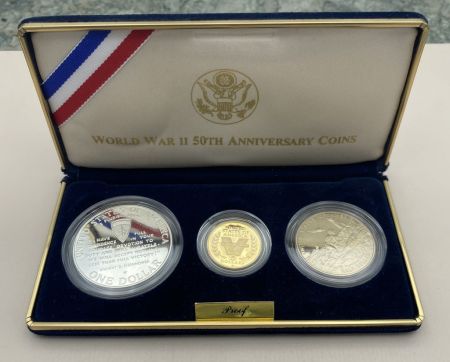 World War II 50th Anniversary Coins, 1x 1993 USA $5, 50th Anniversary of World War II (7.52g of Gold), 1x1993-P USA World War II 50th Anniversary Half Dollar (Clad) 1x 1993-W Proof USA (1991-1995) World War II 50th Anniversary Dollar (24.06g of Silver) World War II 50th Anniversary Coins, 1x 1993 USA $5, 50th Anniversary of World War II (7.52g of Gold), 1x1993-P USA World War II 50th Anniversary Half Dollar (Clad) 1x 1993-W Proof USA (1991-1995) World War II 50th Anniversary Dollar (24.06g of Silver)
