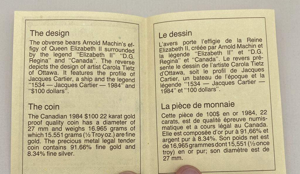 $100 Jacques Cartier Gold Coin, 1x Canadian Gold Coin (15.551g of gold & 1.414g Of Silver) $100 Jacques Cartier Gold Coin, 1x Canadian Gold Coin (15.551g of gold & 1.414g Of Silver)