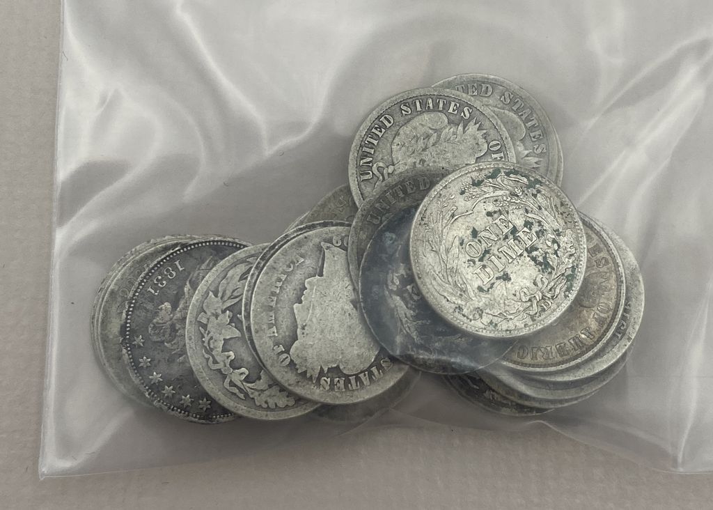 24 Silver Barber Dimes Random Dates, 1 Seated Liberty 1873 (hole at top) and 1 1831 Draped Bust 24 Silver Barber Dimes Random Dates, 1 Seated Liberty 1873 (hole at top) and 1 1831 Draped Bust