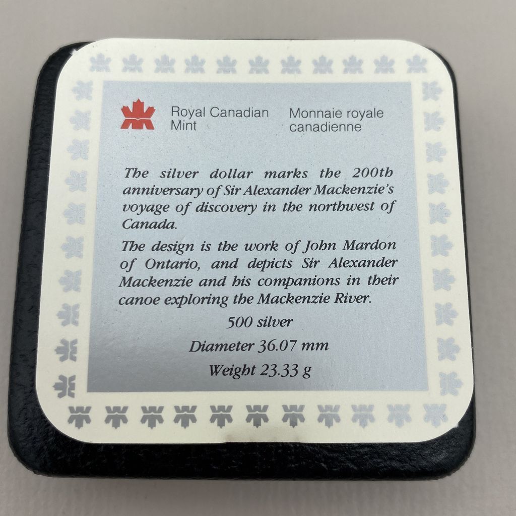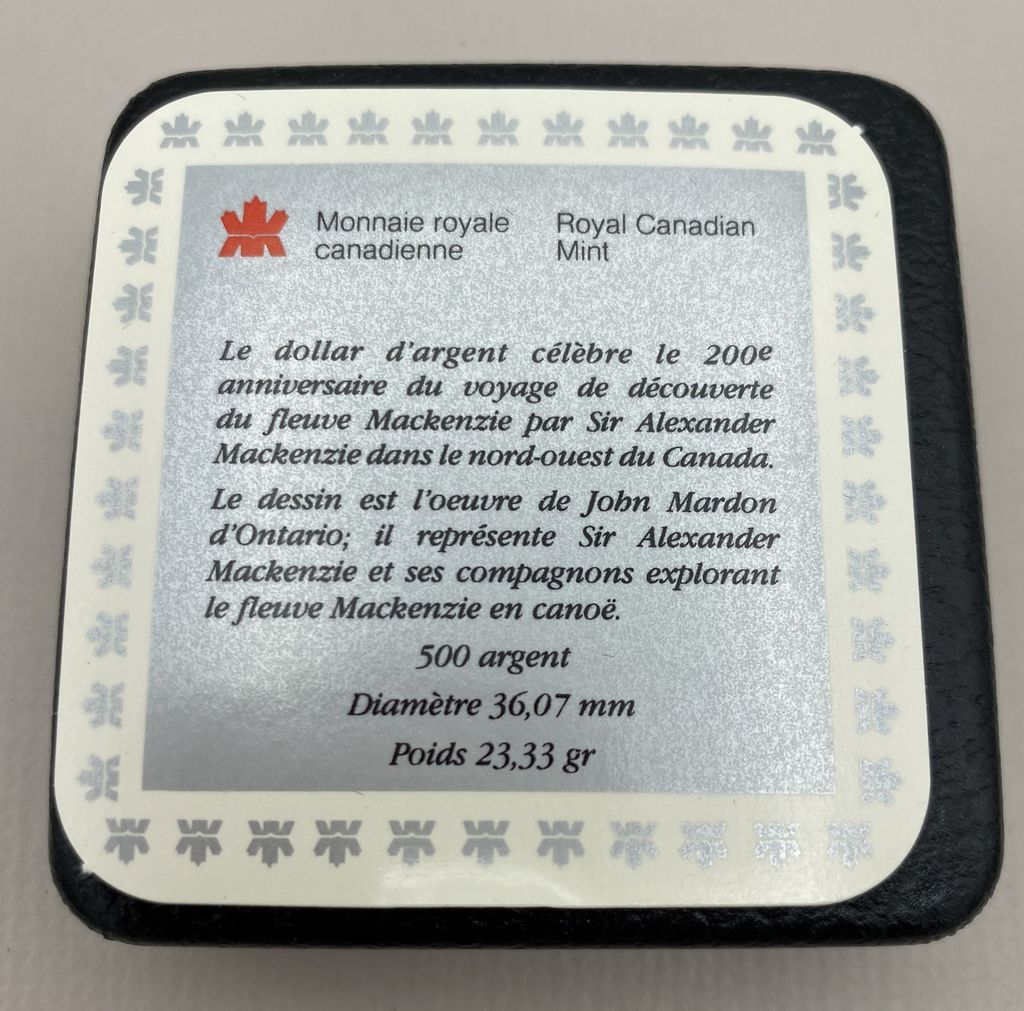 1989 200th Anniversary of the Sir. Alexander Mackenzie Voyage of discovery of northwest of Canada. 10.6 grams of silver. Canadian 1989 200th Anniversary of the Sir. Alexander Mackenzie Voyage of discovery of northwest of Canada. 10.6 grams of silver. Canadian