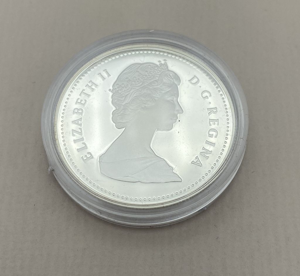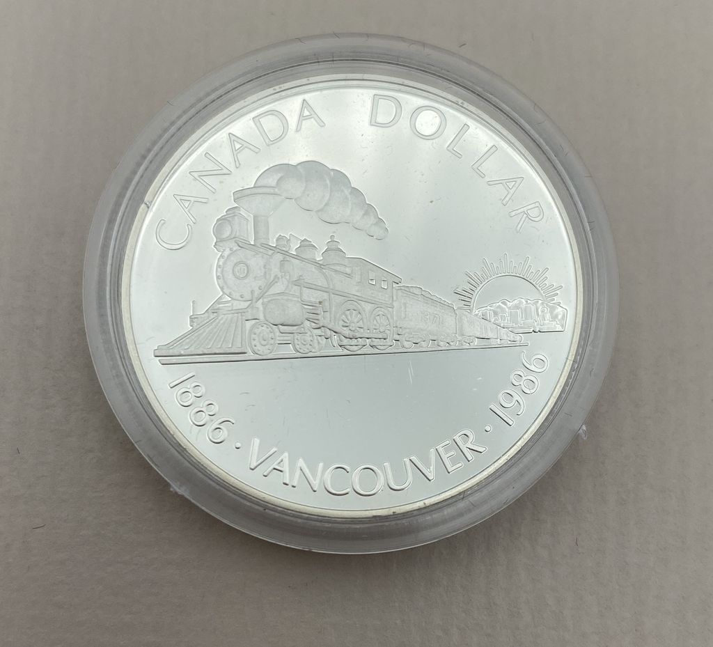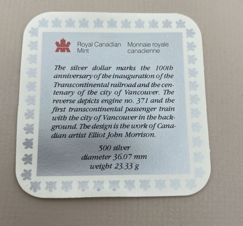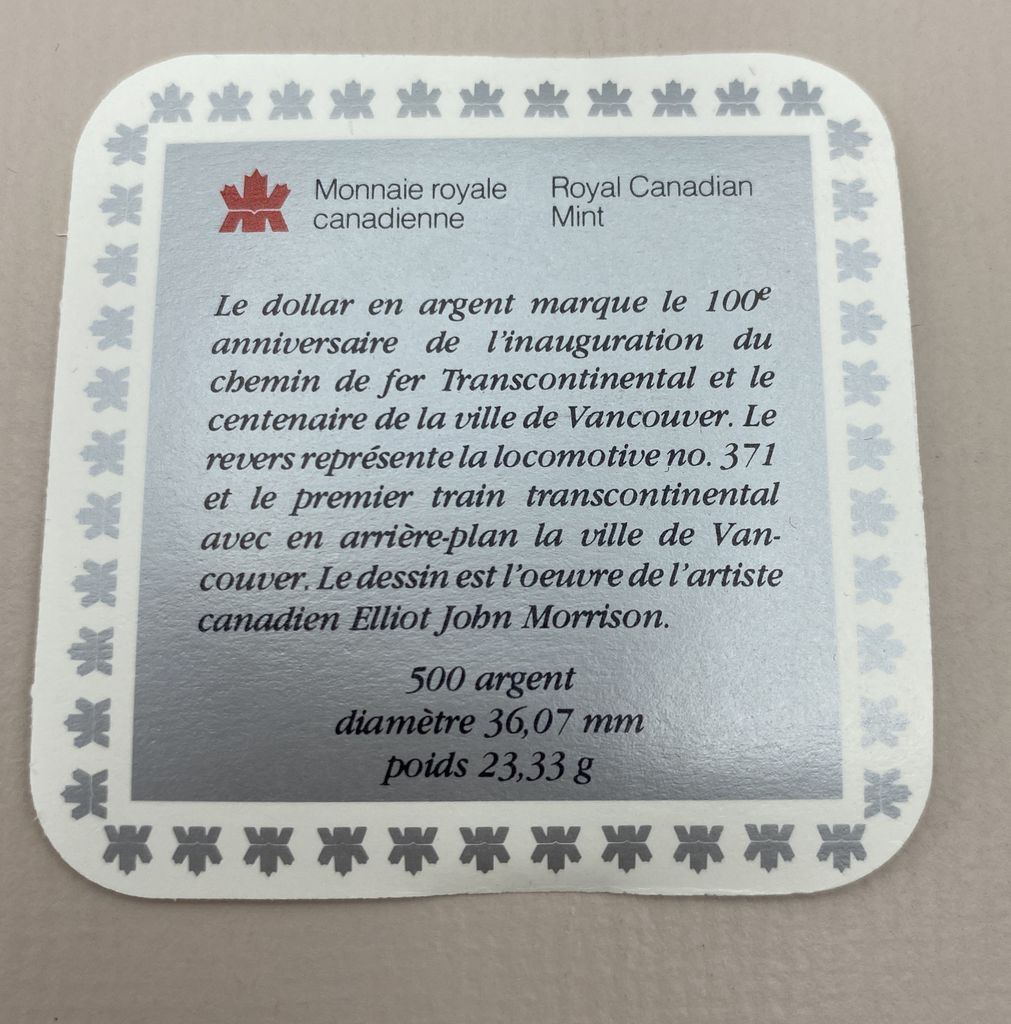 1986 100th Anniversary of the inauguration of the transcontinental railroad. 10.6 grams of silver. Canadian 1986 100th Anniversary of the inauguration of the transcontinental railroad. 10.6 grams of silver. Canadian