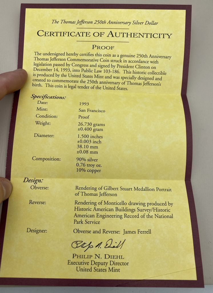 1993-S Proof Thomas Jefferson 250th Anniversary Dollar 1x Thomas Jefferson (24.06g of Silver) 1993-S Proof Thomas Jefferson 250th Anniversary Dollar 1x Thomas Jefferson (24.06g of Silver)