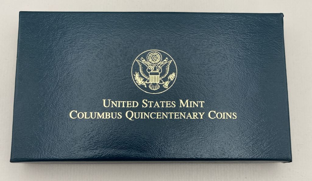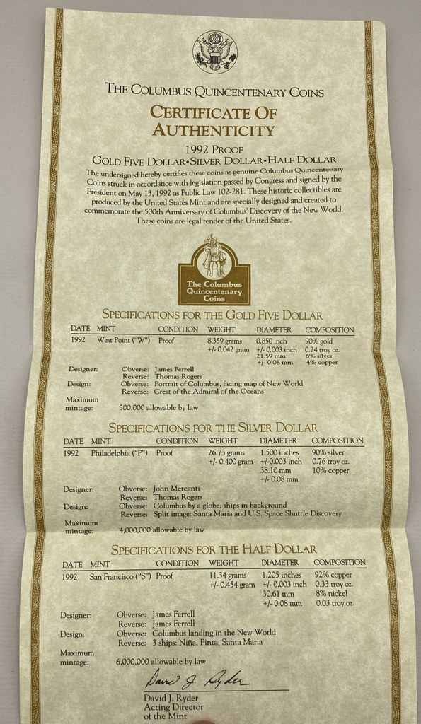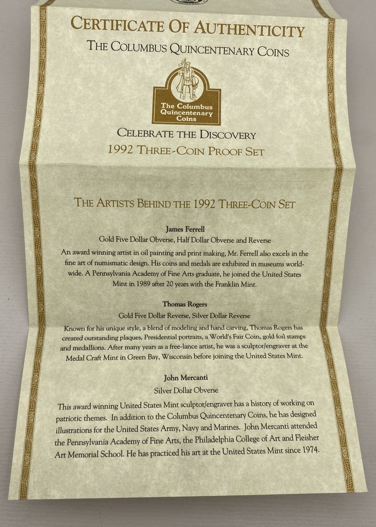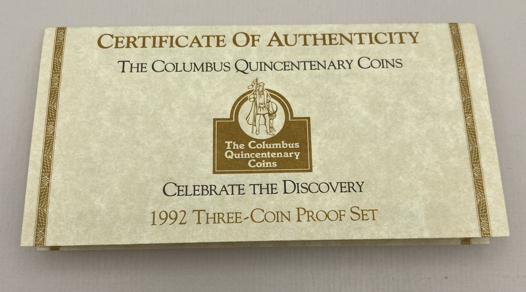 1992 Columbus Quincentenary 3-Coin Proof Set 1x 1992-W $5, 500th Anniversary Columbus Voyage (7.52g of Gold) 1x1992-S Christopher Columbus Quincentenary Half Dollar (Clad) 1x 1992-D Christopher Columbus Quincentenary Dollar (24.06g of Silver) 1992 Columbus Quincentenary 3-Coin Proof Set 1x 1992-W $5, 500th Anniversary Columbus Voyage (7.52g of Gold) 1x1992-S Christopher Columbus Quincentenary Half Dollar (Clad) 1x 1992-D Christopher Columbus Quincentenary Dollar (24.06g of Silver)