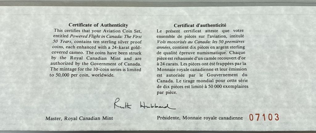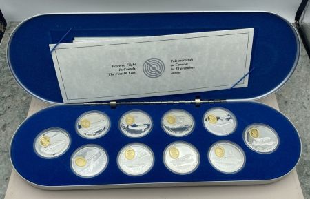 Powered Flight in Canada – First 50 Years Proof Set 10x $20 Coins (28.77g EACH of Silver with 24k Gold Cameo) Powered Flight in Canada – First 50 Years Proof Set 10x $20 Coins (28.77g EACH of Silver with 24k Gold Cameo)