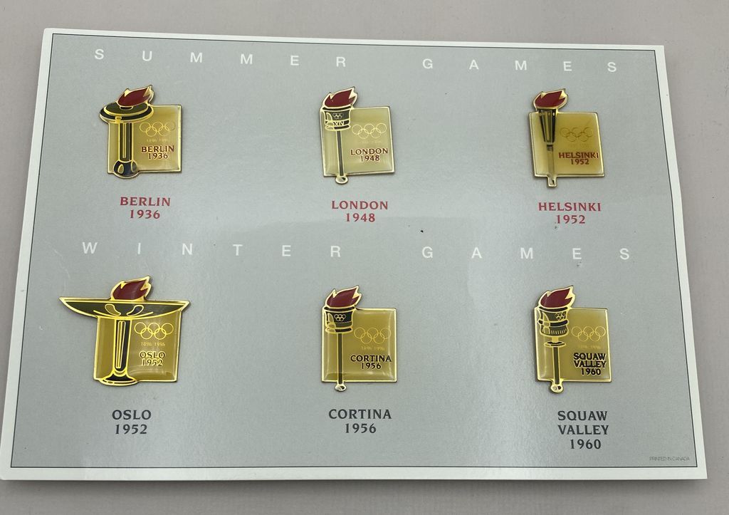 Summer Olympic Games Pins, 1x Berlin 1936 1x London 1948, 1x Helsinki 1952, 1x Oslo 1952, 1x Cortina 1956, 1x Squaw Valley 1960 Summer Olympic Games Pins, 1x Berlin 1936 1x London 1948, 1x Helsinki 1952, 1x Oslo 1952, 1x Cortina 1956, 1x Squaw Valley 1960