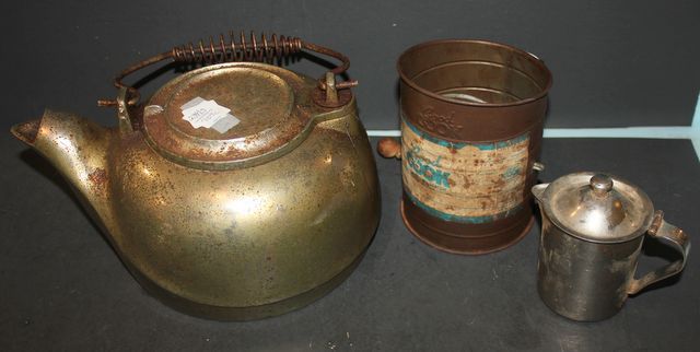 239 Rusted Metal Kettle, Sifter, and Pitcher