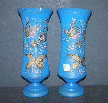 303 Pair of Blue Satin Glass Handpainted Vases 12"h.