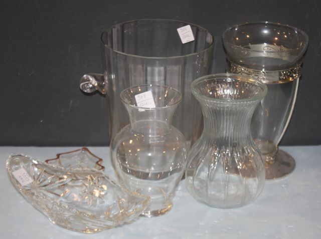 Glass Ice Bucket, Vases, and Relish Dish Glass Ice Bucket, Vases, and Relish Dish