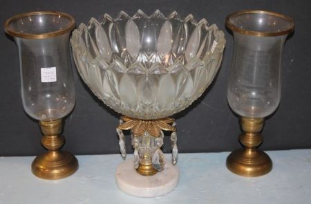 391 Vintage Centerpiece with Prisms, Marble Base and Two Hurricane Shade Candlesticks