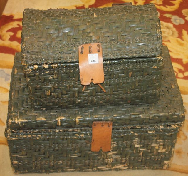 Two Wicker Boxes includes candlesticks and books, 14"h., 19"w. Two Wicker Boxes includes candlesticks and books, 14"h., 19"w.