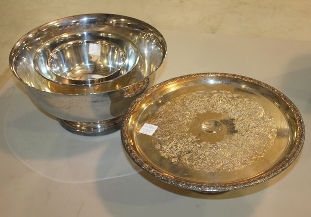 Set of Three Nesting Gorham Silverplate, Paul Reverve, Bowls, Silverplate Cake Stand Set of Three Nesting Gorham Silverplate, Paul Reverve, Bowls, Silverplate Cake Stand