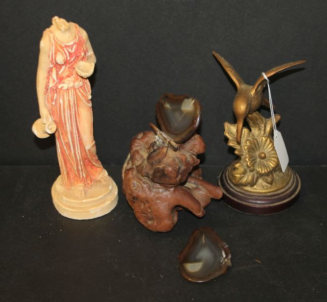 668 Polished Stone Butterfly on Wood Base, Brass Hummingbird, and Headless Figurine