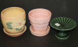 Hull Pottery Flower Pot, Pink McCoy Flower Pot, and Hull Green Compote Hull Pottery Flower Pot (cracks) 5"dia., Pink McCoy Flower Pot 5"dia., and Hull Green Compote 6"dia. Hull Pottery Flower Pot, Pink McCoy Flower Pot, and Hull Green Compote Hull Pottery Flower Pot (cracks) 5"dia., Pink McCoy Flower Pot 5"dia., and Hull Green Compote 6"dia.
