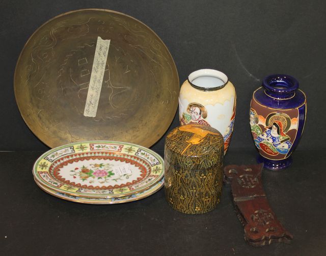 Oriental Brass On Stand, Two Satsuma Style Vases, Made in India Box, Two Oval Painted Platters Oriental Brass On Stand 10"dia., Two Satsuma Style Vases 6"h., Made in India Box, Two Oval Painted Platters 8"dia. Oriental Brass On Stand, Two Satsuma Style Vases, Made in India Box, Two Oval Painted Platters Oriental Brass On Stand 10"dia., Two Satsuma Style Vases 6"h., Made in India Box, Two Oval Painted Platters 8"dia.