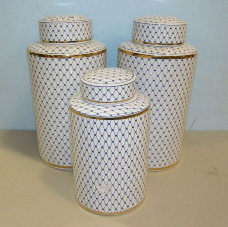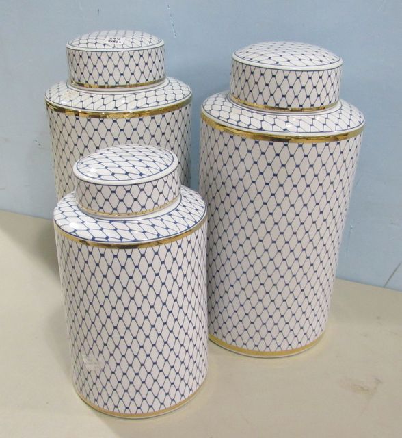 New, Three Covered Jars, Two are 16"h., one is 12"h. New, Three Covered Jars, Two are 16"h., one is 12"h.
