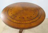 modern reproduction, multi grained inlay design, mahogany finish, claw feet, 30"h., 40"dia. modern reproduction, multi grained inlay design, mahogany finish, claw feet, 30"h., 40"dia.