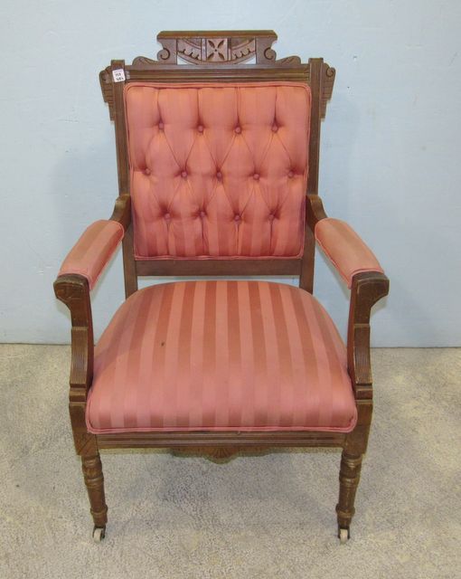 wheels on front legs, pink striped upholstery, 38"h. wheels on front legs, pink striped upholstery, 38"h.