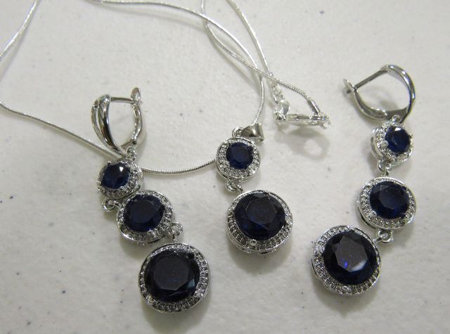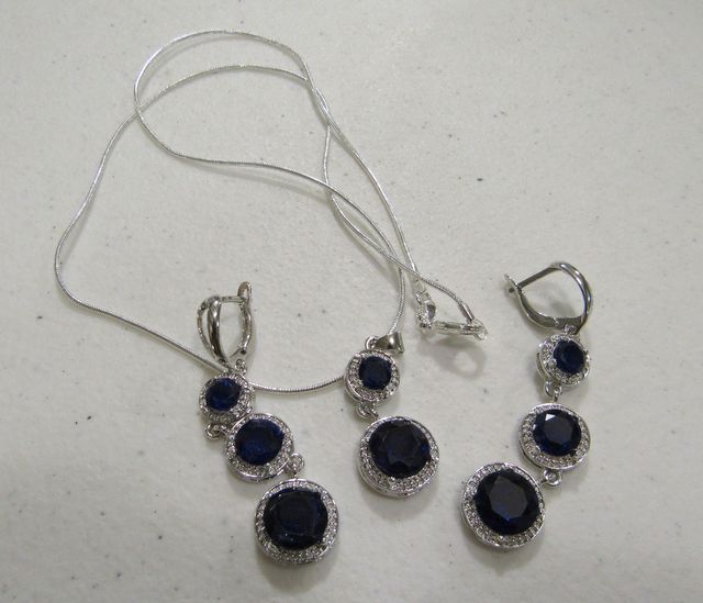 788 Marked .925 Chain with Two Blue Stone pendant and Pair of Blue and Clear Stone Earrins