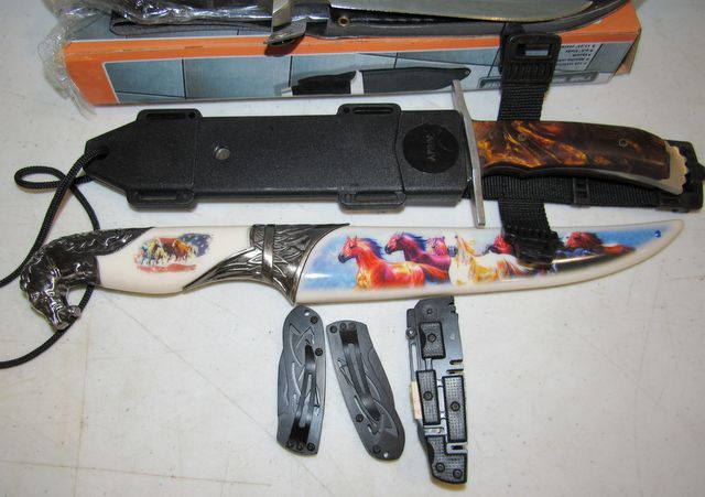 Rubber handled Hunting knife, Plastic and Metal horse dagger, Hunting bowie knife, 2 mini switch blades. Rubber handled Hunting knife, Plastic and Metal horse dagger, Hunting bowie knife, 2 mini switch blades.