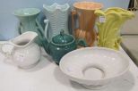 McCoy peach vase 9"h., McCoy Turquoise Vase, Yellow McCoy Swan Vase, USA 219-9, Green USA teapot (chip), McCoy 7528, Floraline Oval bowl (hairline cracks) McCoy peach vase 9"h., McCoy Turquoise Vase, Yellow McCoy Swan Vase, USA 219-9, Green USA teapot (chip), McCoy 7528, Floraline Oval bowl (hairline cracks)