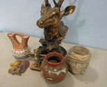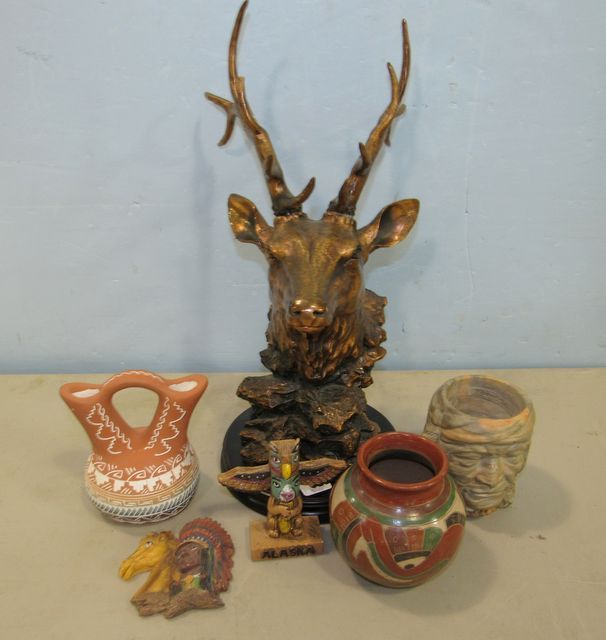 Painted Resin Elk (repaired ear and antler), Native carved holder, Alaska souvenir, S. Benally Southwest Pottery Jar, etc. Painted Resin Elk (repaired ear and antler), Native carved holder, Alaska souvenir, S. Benally Southwest Pottery Jar, etc.