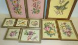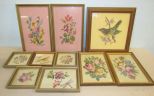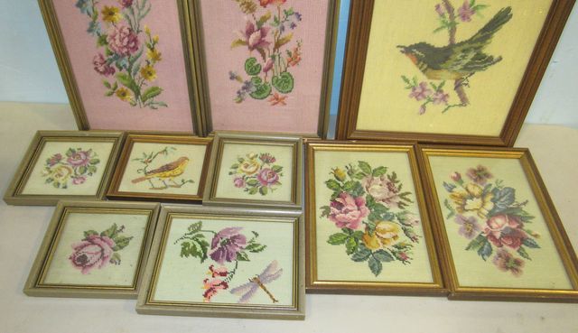 Bird 14" x 14", Pair of flowers, five small needlepoints, pair of flowers. Bird 14" x 14", Pair of flowers, five small needlepoints, pair of flowers.
