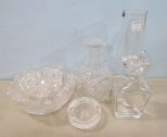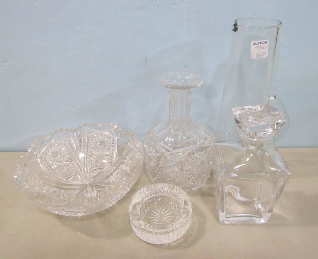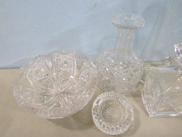 Cut glass bowl 8"dia., Cut Glass Vase 8"h., Signed Decanter, ashtray, water pitcher. Cut glass bowl 8"dia., Cut Glass Vase 8"h., Signed Decanter, ashtray, water pitcher.