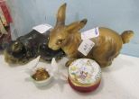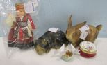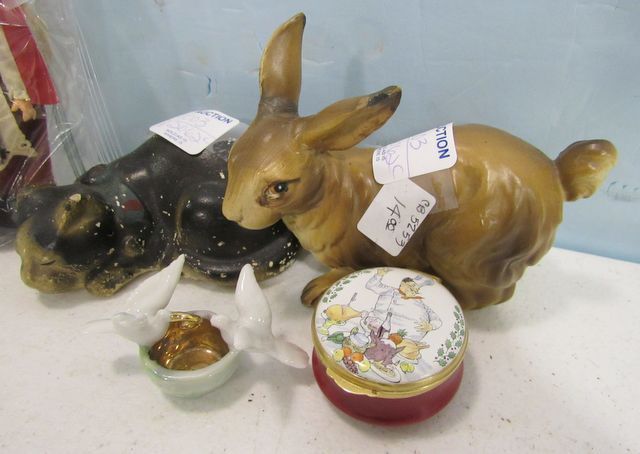 1016 International Doll, Rabbit, Dove Ornament, Chalkware Cat, and a Crummles Fortnum and Mason Trinket Box
