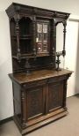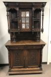 Antique Circa 1900 English Hunting Cabinet, Belgique Inc, two piece, with two top pedestals, beveled mirrored door, two drawers, two bottom drawers, ornate carved trim and faces, good condition, missing one side trim on top side, has key, 84"h., 47"w., 22"d. Antique Circa 1900 English Hunting Cabinet, Belgique Inc, two piece, with two top pedestals, beveled mirrored door, two drawers, two bottom drawers, ornate carved trim and faces, good condition, missing one side trim on top side, has key, 84"h., 47"w., 22"d.