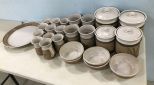 Meredith Pottery, Tankards, bowls, Mugs (one has repaired handle, canisters, charger. Meredith Pottery, Tankards, bowls, Mugs (one has repaired handle, canisters, charger.