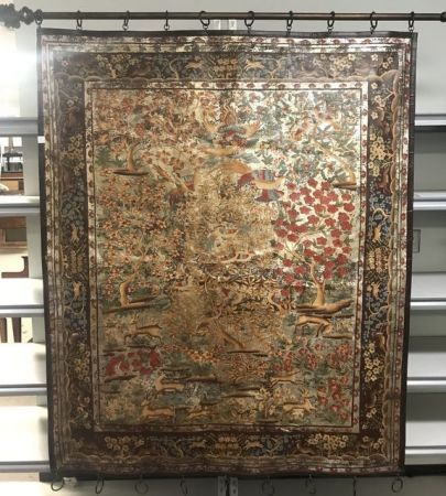 Modern Decorative Large Hand Painted Cloth Panel, with hanging rod, animals and floral designs, 69"h., 57"w. Modern Decorative Large Hand Painted Cloth Panel, with hanging rod, animals and floral designs, 69"h., 57"w.