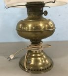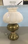 Vintage Brass Electrified Globe Lamp, with white shade, and hurricane shade, has some small dents, 20"h. Vintage Brass Electrified Globe Lamp, with white shade, and hurricane shade, has some small dents, 20"h.