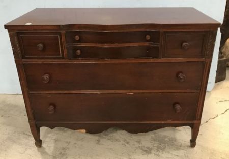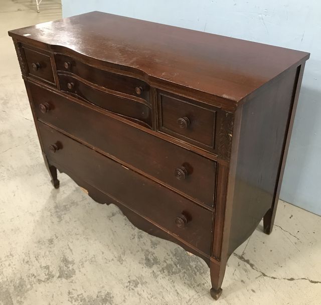 Hibriten Furniture Company Dresser, 6 drawers, vintage, has finish wear, scratches, missing one knob, couple of veneer spots missing, 35"h., 46"w., 20"d. Hibriten Furniture Company Dresser, 6 drawers, vintage, has finish wear, scratches, missing one knob, couple of veneer spots missing, 35"h., 46"w., 20"d.