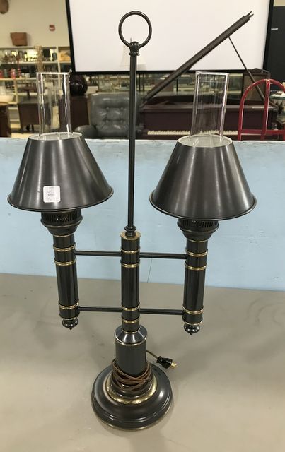 Brass and Gray Two Arm Student Lamp, tin shades with hurricane shades, good condition, 30"h. Brass and Gray Two Arm Student Lamp, tin shades with hurricane shades, good condition, 30"h.