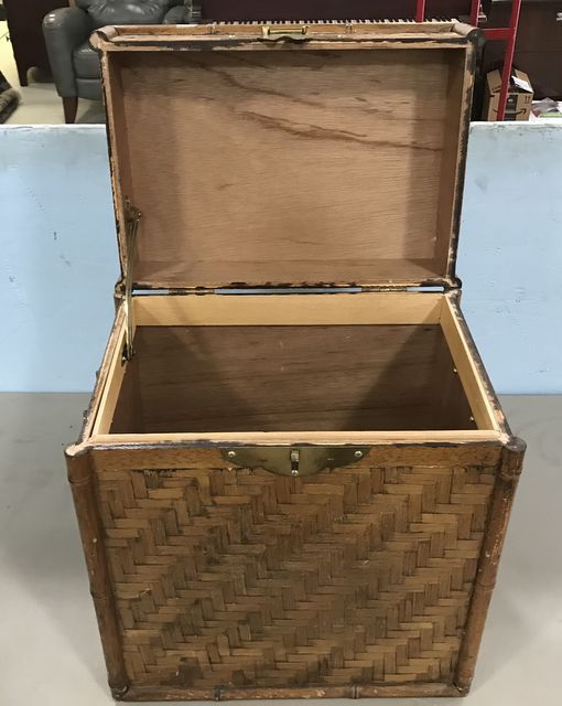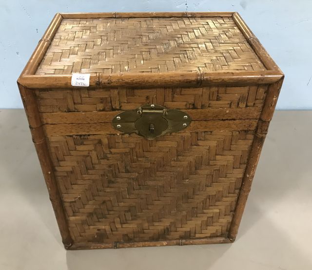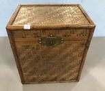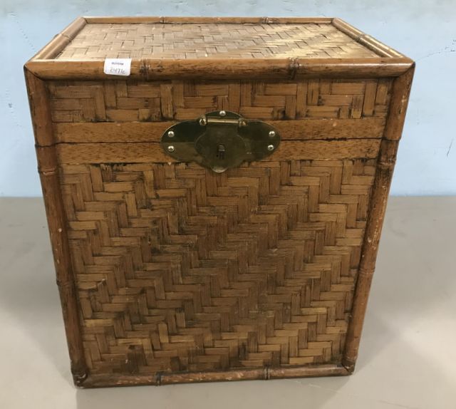 Woven storage box, lift top, handled, brass latch, 18"h., 16"w. Woven storage box, lift top, handled, brass latch, 18"h., 16"w.