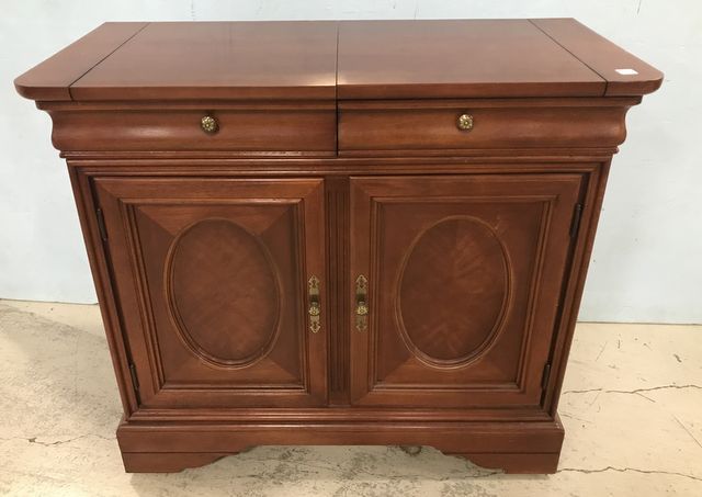 Modern Cherry Server/Bar, two drawers, two doors, fold out top, on wheels, 34"h., 38"w., 18"d. Modern Cherry Server/Bar, two drawers, two doors, fold out top, on wheels, 34"h., 38"w., 18"d.