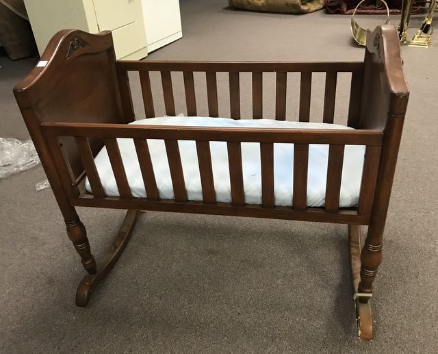 Antique Reproduction Baby Cradle, with pad and skirts, cherry, good condition 36"h., 39"w., Antique Reproduction Baby Cradle, with pad and skirts, cherry, good condition 36"h., 39"w.,