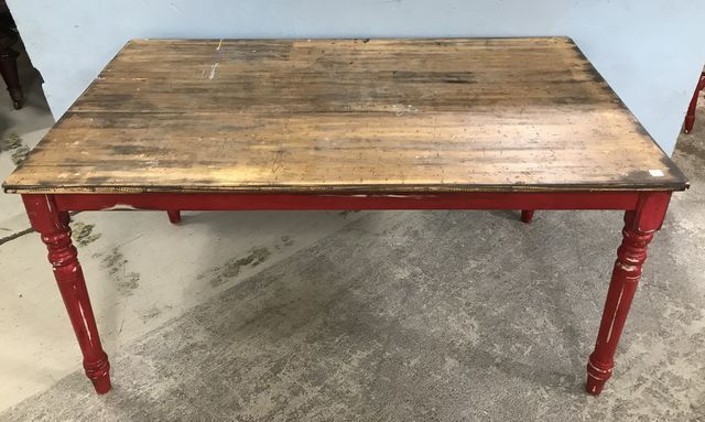 Modern farm style dining table, red painted base, wood top, has minor wear, some painted drips on top, 29"h., 60"w., 36"w. Modern farm style dining table, red painted base, wood top, has minor wear, some painted drips on top, 29"h., 60"w., 36"w.
