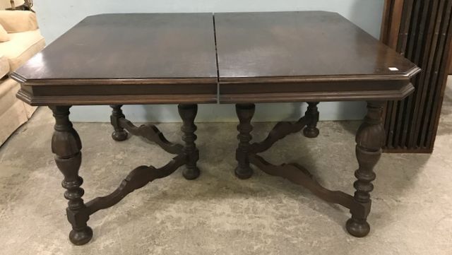 Early 1900's Mahogany Dining Table, 6 legs, has scratches on finish, comes with a rack of 8 leaves. Early 1900's Mahogany Dining Table, 6 legs, has scratches on finish, comes with a rack of 8 leaves.