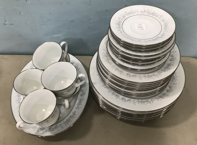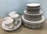 Contemporary by Noritake China Set, 8 dinner plates (one has rim chip), 8 salad plates, platter, 8 saucers, 6 cups, 2 dessert plates. Contemporary by Noritake China Set, 8 dinner plates (one has rim chip), 8 salad plates, platter, 8 saucers, 6 cups, 2 dessert plates.