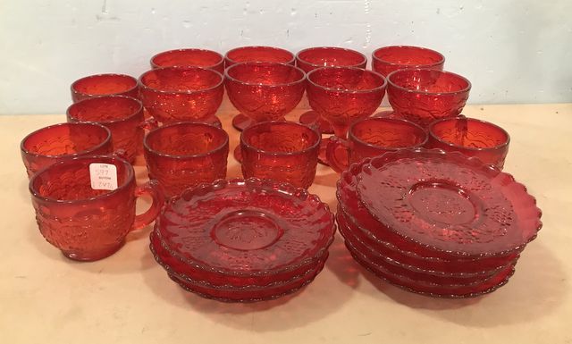 Vintage Red Cups and Saucers, grapefruit pattern, marked on bottom, sherbets, cups, and saucers. Vintage Red Cups and Saucers, grapefruit pattern, marked on bottom, sherbets, cups, and saucers.