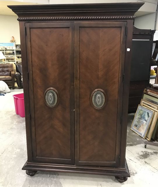 Thomasville Earnest Hemmingway Collection Mahogany Finish Two Door Armoire/entertainment center, has some finish wear, 80"h., 47"w., 21"d. Thomasville Earnest Hemmingway Collection Mahogany Finish Two Door Armoire/entertainment center, has some finish wear, 80"h., 47"w., 21"d.