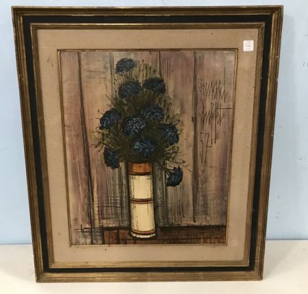 Bernard Buffet 1957 "Le Bouquet" Oil on Canvas, framed, Born in Paris, France, studied at Ecole Nationale Superieure des Beaux-Arts, he was 29 years old when he did this work, 29"h., 25"w. Bernard Buffet 1957 "Le Bouquet" Oil on Canvas, framed, Born in Paris, France, studied at Ecole Nationale Superieure des Beaux-Arts, he was 29 years old when he did this work, 29"h., 25"w.