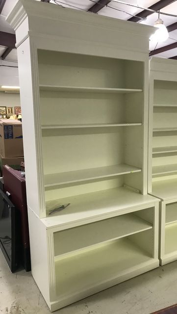 Step Back White Display Cabinet, two piece, three shelves, 99"h., 25"d., 48"w. Step Back White Display Cabinet, two piece, three shelves, 99"h., 25"d., 48"w.