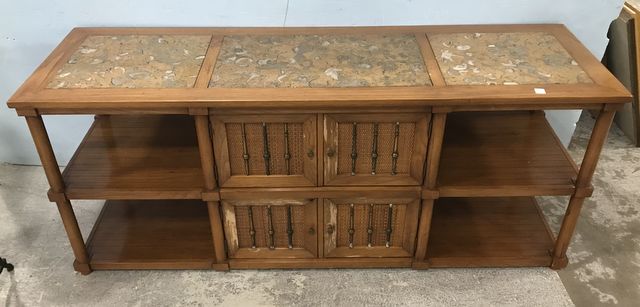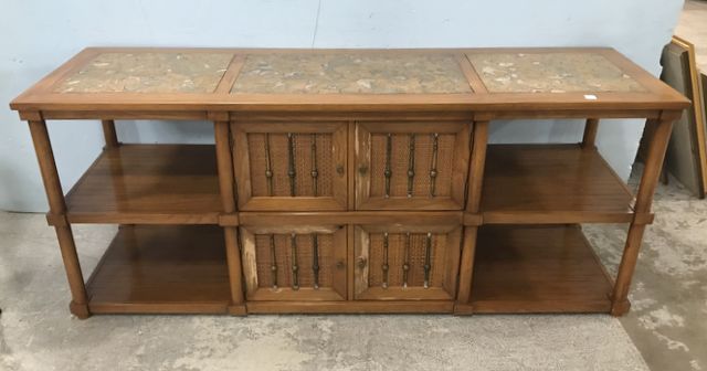 Sophisticate by Tomlinson Wall Console Credenza, three marble top panels, four door, has finish wear on the doors, 27"h., 65"long, 17"d. Sophisticate by Tomlinson Wall Console Credenza, three marble top panels, four door, has finish wear on the doors, 27"h., 65"long, 17"d.